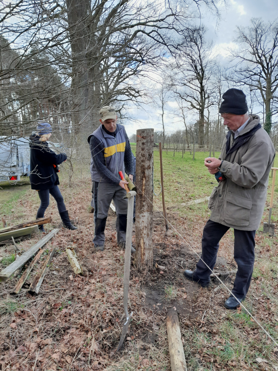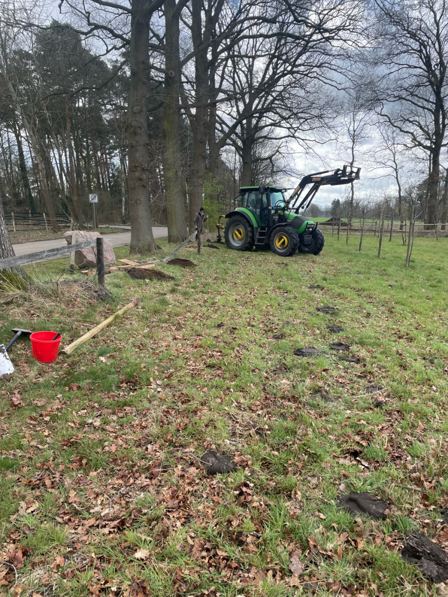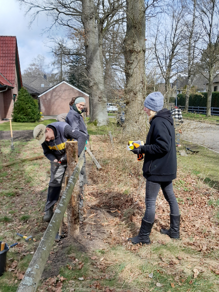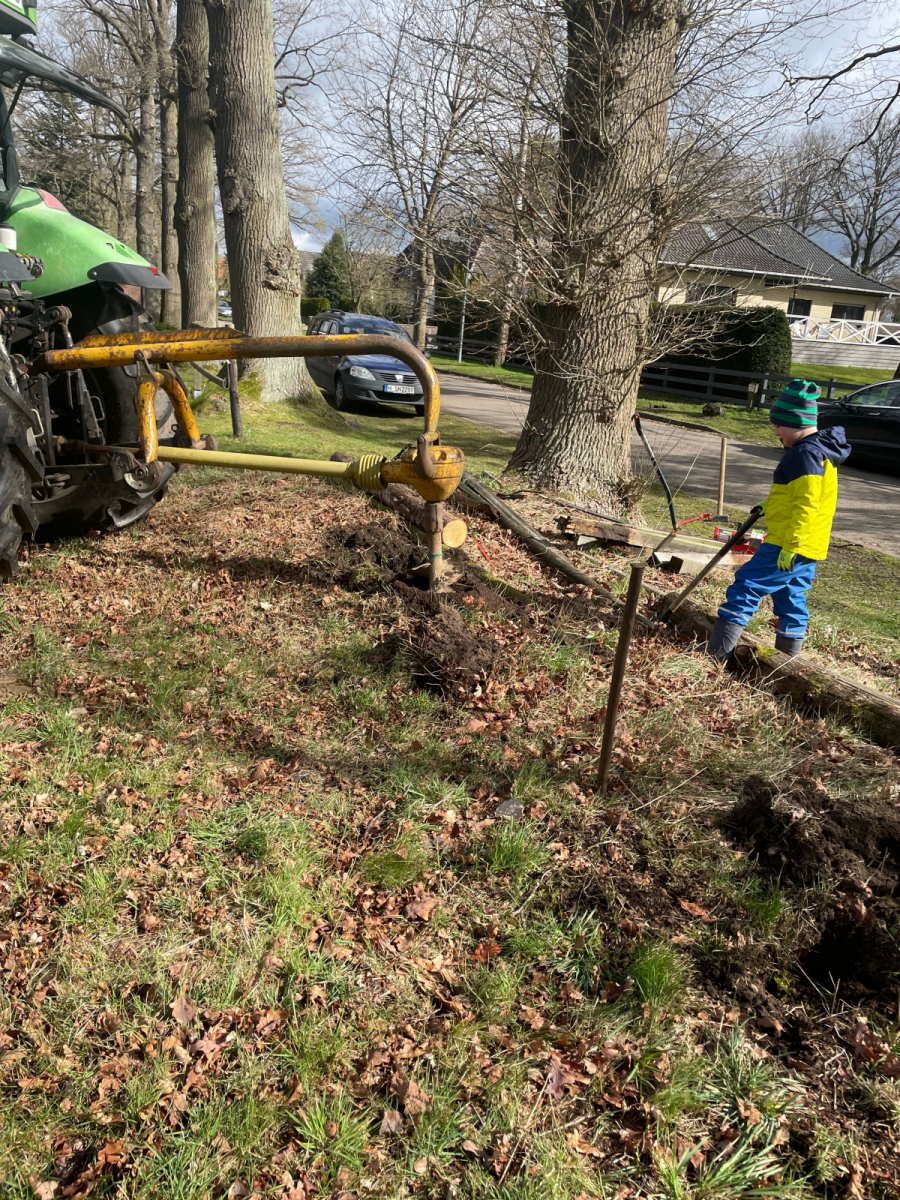 Ausgerüstet mit Kuhfuß, Hammer und reichlich Nägeln haben am Samstag, 09.04.22 freiwillige Helferinnen und Helfer des Bürgervereins den maroden Zaun an der Obstbaumwiese wieder flott gemacht. Dieser musste an einigen Stellen erneuert werden, da die alten Zaunpfähle nicht mehr Stand hielten. Für die Löcher kam sogar schweres Gerät zum Einsatz. Ein Erdbohrer – bedient von Ralf Göing.